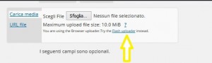 - In alto accanto a GESTIONE FILES cliccare su aggiungi nuovo. Viene proposta una funzione già pronta, in un rettangolo trovi scritto “selezionare i file”. E’ necessario selezionare la modalità di caricamento tramite flash uploader, selezionare perciò la funzione – vedi immagine